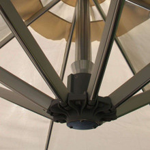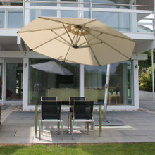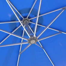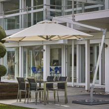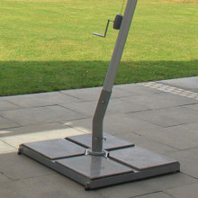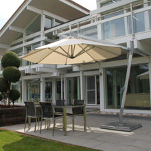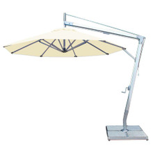 This tasteful outdoor umbrella has a refined contemporary design that adds a touch of class to any deck or patio. Its angular frame is offset and suspends the canopy from above. This creates a large open shaded area below, despite the relatively small size of the umbrella. The aluminum posts are corrosion-resistant and have durable stainless steel connectors. The convenient metal base has adjustable feet to accommodate uneven surfaces, while still providing stability. Like the frame, the rib assembly is made from aluminum, but the hub and runner are cast from marine grade nylon. The cantilever umbrella is raised and lowered via a winch system that is controlled by a crank on the frame.