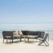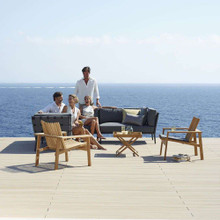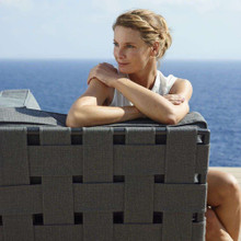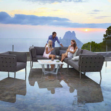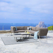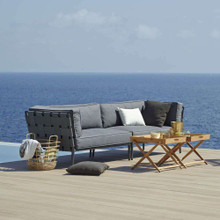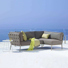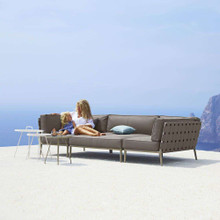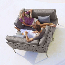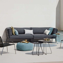 This stylish outdoor loveseat has a chic modular design with high-end contemporary appeal. Its trim aluminum frame is powder-coated for weather-resistance and supports wide bands of Cane-line AirTouch® fabric. The sofa is upholstered with thick matching cushions with QuickDry foam inserts. The cushions and bands are available in Light Grey or a darker Grey palette.