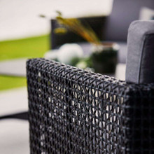 This chic outdoor sofa has a minimalist squared design with understated elegance. Its wide woven body is made of durable resin wicker with a taupe or black-anthracite finish. The polypropylene weave resist weather damage and is much longer lasting than typical natural wicker or rattan. The legs have stainless steel caps over a galvanized steel core, so they are not only attractive but sturdy too. Optional cushion sets are available in white, grey or taupe Sunbrella Natte. This premium outdoor textile is colorfast and a breeze to maintain. The QuickDry foam inserts ensure that the upholstery does not remain damp for long.
