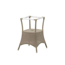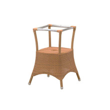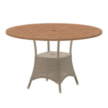 This charming outdoor dining table has a relaxed feel and appealing design. Its tapered base is made of resin wicker that is fade and weather-resistant - much more durable that organic wicker. The polypropylene comes in your choice of taupe, natural or sand color. The circular tabletop is made of solid teak and the woodgrain will patina from a golden honey to silvery grey over time. The top also includes a hole for a market umbrella.