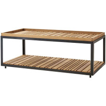 This sleek two level outdoor cocktail table has clean lines and an upscale vibe. Its trim aluminum frame is powder-coated in Lava Grey for weather resistance and comes in both square and rectangular versions. The bottom and top surfaces are available in light grey ceramic or natural teak. The wooden tabletop is designed to be a removable tray, which makes serving guests and busing the table extremely easy.