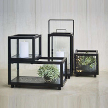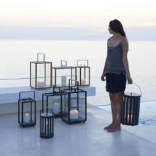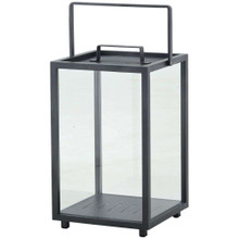 This handsome candle lantern has a simple yet elegant design. Its angular aluminum frame is powder-coated in a rich Lava Grey color (small size also comes in Taupe and Dark Green) with tempered glass walls to house a candle inside. The outdoor lantern features two handles - one to access the inside and another to carry the lantern itself. It comes in four sizes to accommodate a variety of spaces.