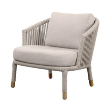 This interesting outdoor lounge chair has a subtle sophisticated style and unique design. Its sloping frame is made of galvanized steel wrapped with Cane-line Soft Rope in grey or sand. The strands of polypropylene also stretch vertically from the top and bottom of the wrap-around body. This high-end lounger is upholstered with thick Sunbrella AirTouch cushions with QuickDry foam inserts. This durable fade-resistant textile is comfortable and easy to maintain.
