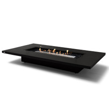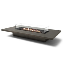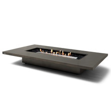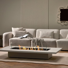 This long sophisticated fire pit table has a low-profile rectangular design made from Fluid™ concrete composite material in three neutral tones. It comes with a tempered glass fire screen and can burn bio-ethanol, natural gas or liquid propane.