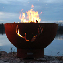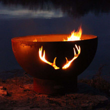 This handsome firebowl features striking antler silhouette cutouts that glow with life when a fire is burning inside. The rustic fire pit is artisan crafted by hand using durable carbon steel with a maintenance-free iron oxide finish that patinas into a deep brown color.
