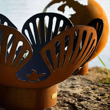 This delightful fire feature has an eye-catching design and coastal appeal. Its seashell and starfish body is beautifully silhouetted when backlit by a roaring flame. The shapely fire pit is hand-crafted from sturdy 1/4 inch thick carbon steel and sandblasted before coated with an oxidized iron finish. The metal will darken over time and requires very little upkeep.