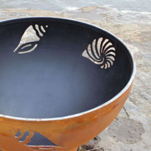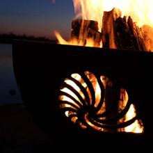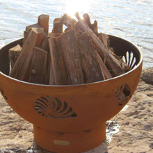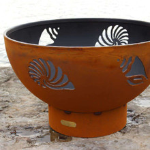This attractive firepit is inspired by the natural treasures discovered during long walks on the beach. The ample bowl is covered with intricate cutouts of nautilus, conch and scallop sea shells. It's handmade in the U.S.A. by craftsmen using heavy duty carbon steel with a rustic oxidated iron finish that patinas into a dark brown as it ages.