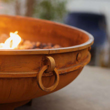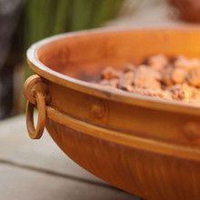 The fire pit has a rich oxidized iron finish that ages to a deep mahogany color over time. The rivets, band and rings accent this elegant fire feature and reinforce its antique look and feel. It's a great choice for traditional outdoor settings, but it also adds a touch of antiquity to minimalist modern patios.