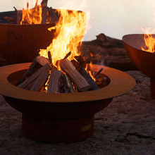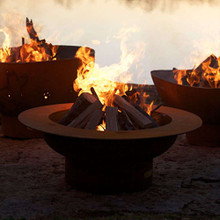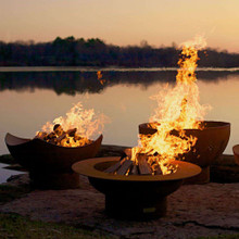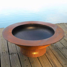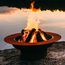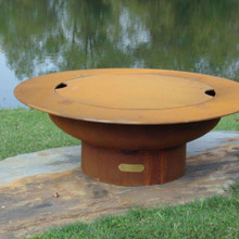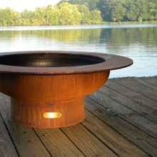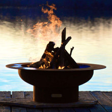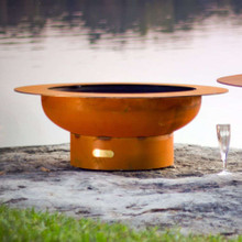 This marvelous fire pit has an intriguing flat ring that encompasses its bowl and provides a convenient resting place for drinks and snacks when a fire is not burning. Similar to the larger Magnum Fire Pit, the Saturn is handcrafted in the U.S.A. using heavy duty carbon steel. The metal is finished in your choice of brushed bronze, metallic black or an oxidized iron that darkens as it matures.