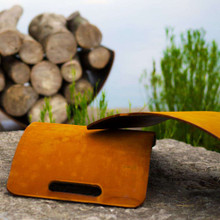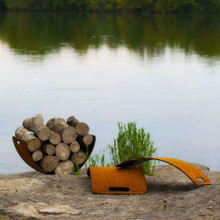 This graceful rack cradles your firewood between its two interlocking pieces. The curved components are made from carbon steel and have a rugged iron oxide finish that ages beautifully and requires no special attention.