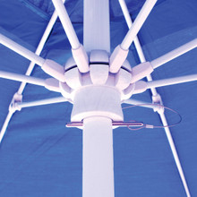 This small commercial-grade market umbrella has a simple design and universal appeal. Its 1.5 inch pole and ribs are made with durable aluminum and the two-piece pole is joined via a threaded coupling in the middle. The metal is powder-coated in your choice of antique bronze, black or white. The finish protects the metal against rust and other damage from extended exposure to the elements.
