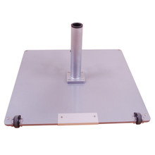 This teak shade can be used through an umbrella hole in a dining table, as long as the crank can clear the tabletop (39 inches) or alone. When combined with a table, it only needs a base weighing 40-60 pounds. However, freestanding set-ups require 75 pound umbrella stands or more. Galtech offers a chic round cast iron base in two finishes, as well as a number of sizes of square steel plate bases for even more stability.