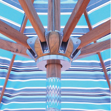 This teak center pole umbrella has a 9 foot octagonal canopy in many Sunbrella colors. It has a crank lift with a rotational tilt system.