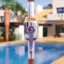 This dynamic centerpost umbrella has a familiar look and innovative design. Its two-piece pole is 1.5 inches in diameter and made of long-lasting teak. The piece join by a push-button coupling in the middle. The durable hardwood is naturally oil-rich, which protects it against the elements. It begins with a honey brown woodgrain finish that transitions to an elegant silver grey over time if not oiled periodically.