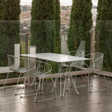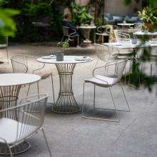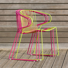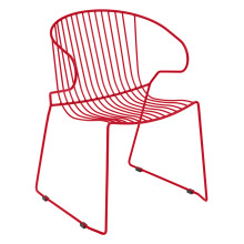 This outdoor dining armchair has a powder-coated galvanized steel wire frame in multiple colors. It features organic lines and can be stacked.