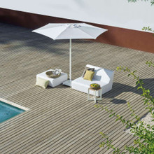 This sophisticated market umbrella has a streamlined design and ritzy appeal. Its slim center pole, ribs and hub assembly are crafted from lightweight aluminum and powder-coated to protect the metal from rust and corrosion. The finish is available in anodized silver, matte white, charcoal and a faux teak woodgrain.
