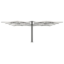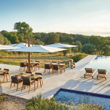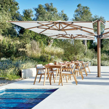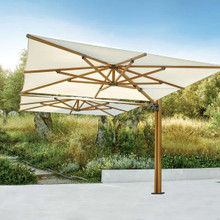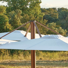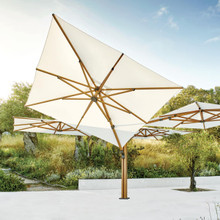 This patio umbrella is configurable and can support two, three or four canopies. Each square shade measures 10-feet across and is made from Sunbrella® fabric. The solution-dyed acrylic material is colorfast, tear and UV-resistant and repels water. There are many vivid colors and chic neutral tones from which to choose. The canopies are raised and lowered by means of a crank, and they can be opened and tilted independently of one another. The tilt has an infinite number of positions to give you ultimate control over the shade.
