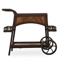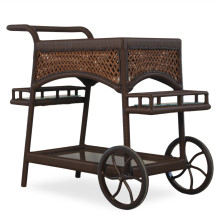 This beautiful rolling bar cart has an all-weather vinyl wicker body in caramel or bisque. It has large upper and lower serving areas and two small storage sections with glass bottoms.