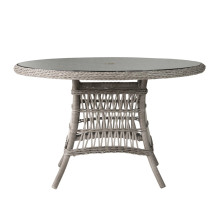 This large outdoor dining table has a romantic coastal vibe and a casually elegant appeal. Its flared base is handcrafted from corrosion-resistant welded aluminum and wrapped in all-weather vinyl wicker. The weathered grey putty vinyl fibers are wound around the bowed metal legs and stretched across the framework in a criss-cross open weave pattern. Even the spacious round tabletop is woven. There's a clear tempered glass pane that lays on top with an umbrella hole in the middle.