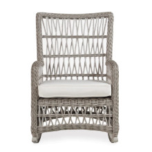 This charming outdoor rocking chair has a putty grey vinyl wicker body with an open weave design. Its comfortable quick-dry seat cushion is covered with weather-resistant fabric in a vast array of rich solids, eye-catching stripes and decorative patterns.