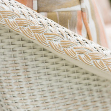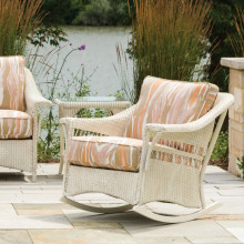 This relaxed patio rocking chair is handcraft using all-weather Lloyd Loom wicker in many custom finishes. Its plush upholstery combines quick-drying foam inserts with durable, colorfast synthetic fabric covers in over one hundred patterns, stripes and solid colors.
