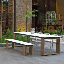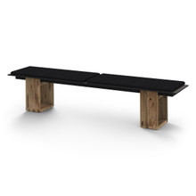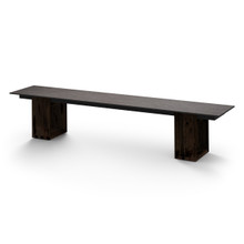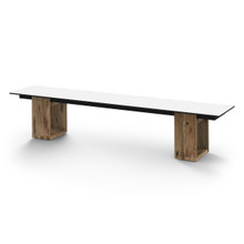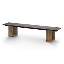 This impressive outdoor bench keeps it simple. Its utilitarian minimalist design focuses on function rather than ostentation. The heavy wooden leg base is made from environmentally responsible reclaimed teak hardwood and processed using Mamagreen's "drift-look" finishing. This technique creates a driftwood appearance by adding distressing to the wood's already unique coloration and texture. This carefree relaxed finish comes in a light colored original drift or dark espresso hue.