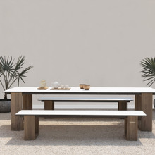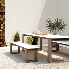 The top of this large patio bench is comprised of a modern high pressure laminate (HPL) in a number of chic neutral colors. This composite materials is easy to clean and provides a strong seating area. An optional hand-stitched faux leather seat cushion set is also available to provide additional comfort. This bench coordinates with the Aiko diing table or can serve as a standalone outdoor seating option.