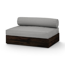 This wide modular outdoor sofa seat has a broad frame of recycled teak in light and dark timeworn finishes, with thick Sunbrella® cushions in multiple colors and optional high pressure laminate arms in two contrasting hues.