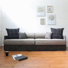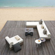 This spacious patio sectional sofa seat has broad visual appeal and indulgent comfort. Its simply elegant contemporary design has clean lines, extra wide seating and thick cushioning. The Spartan box frame is made from "upcycled" reclaimed teak wood and processed using Mamagreen's new "drift-look" finishing. This revolutionary technique creates the beautiful weather-worn appearance of driftwood, without losing any of the hardwood's structural integrity. The frame is available in either a light natural woodgrain drift finish or a deep espresso color. Both versions highlight the individual character of each piece of wood and have a rustic texture-rich surface.