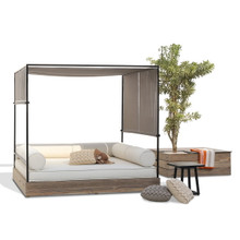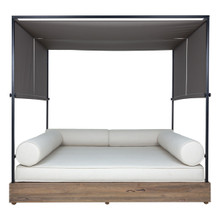 A spacious teak outdoor daybed with a canopy, plush Sunbrella cushions and adjustable shade, perfect for creating a private, resort-style retreat beside the pool or at the edge of a large terrace.