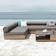 This laid back outdoor sectional sofa seat has a little extra something when it comes to comfort. Its minimalist modern design includes both deep seating and plush oversized cushions. The simple base frame is made from eco-friendly reclaimed teak and incorporates Mamagreen's new "drift-look" finish in both light woodgrain and dark espresso. This unique texture-rich look has the appearance of weathered driftwood, while retaining the strength and durability of this renewable hardwood.
