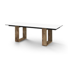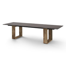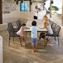 The top of this expansive outdoor dining table is made from sleek high pressure laminate (HPL) in your choice of laterite, scratched grey, alpes white, slate, carrrara white, carrara black or volcanic ash colors. HPL is easy to clean, resists marking and provides subtle style. The table is available in two lengths and coordinates with the Aiko bench and many of the other Mamagreen patio dining chairs.