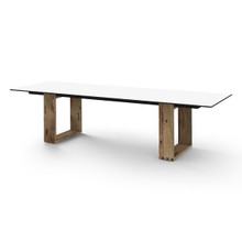 This majestic patio dining table is surprisingly nimble. Its Spartan yet contemporary design adjusts to three different leg positions to accommodate a variety seating arrangements and allow easy chair access. The simple base is constructed using eco-friendly reclaimed teak that has undergone Mamagreen's "drift-look" finishing process. This novel technique enhances the unique beauty in each piece of wood and highlghts variations in texture and color to create a memorable driftwood appearance. Choose from either the original light woodgrain color or striking espresso tone.