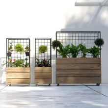 The planters also have a sturdy aluminum frame powder-coated in a handsome neutral tone with a sand-blasted matte sand or ultra-durable semi-gloss finish. Each frame includes a simple trellis for hanging small potted plants or to provide a surface for vines to climb. Lastly, the bottom of the planters feature caster wheels which allow you to move the planters across the deck or patio to get better light, provide easier access to water or to simply change up the aesthetic arrangement.