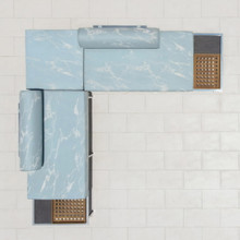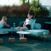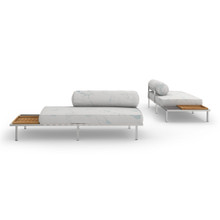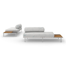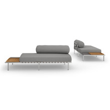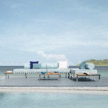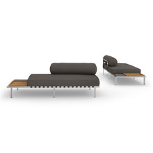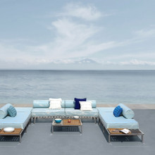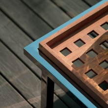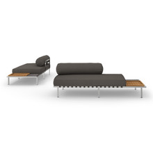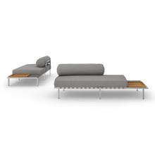 This modular loveseat has an integrated end table on either the right or left hand side. The tabletop is comprised of high-pressure laminate and a removable plantation teak tray. The HPL is available in multiple hues while the grated hardwood tray has a beautiful honey smooth-sanded woodgrain finish.