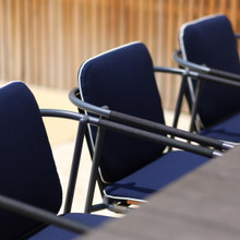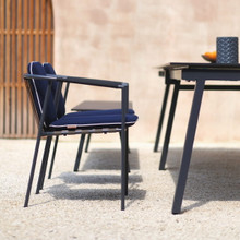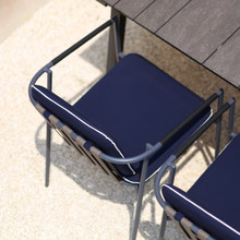 The armrests of this patio dining chair are wrapped in Leisuretex® in white, grey or black. This durable synthetic fabric is soft and adds a little flair to the seat.