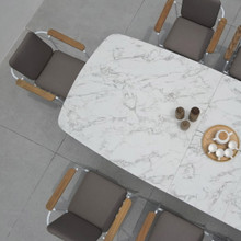 This modern patio dining chair has a trim stainless steel frame in a stylish hairline or classic powder-coated finish with teak armrests and attractive quick-dry cushions in a number of synthetic textiles and tones.