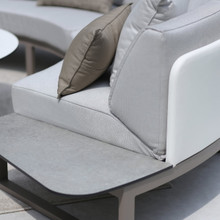A unique characteristic of this configurable patio sofa is its integrated side table. The soft-cornered tabletop (available on either the right or left hand side) is made from modern high-pressure laminate. HPL is strong, impact and scratch-resistant and easy to maintain. It comes in multiple neutral shades with subtle natural patterns.