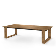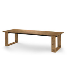 This spacious outdoor dining table has a clean look and casually elegant design. Its broad box-like base and long top are crafted from recycled teak. The eco-friendly wood has a beautiful brushed finish that creates a subtle texture and reinforces the natural aesthetic of the table.