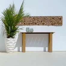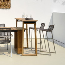 This intriguing outdoor bar table has a trim Zen-like design that embraces the beauty of simplicity. Its wooden frame and slatted tabletop are crafted from eco-friendly recycled teak with a soft brushed finish. The supports have a slightly tapered shape that is reminiscent of Asian architecture and adds to the stability of the piece.