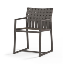 This handsome patio dining chair has a dynamic contemporary design and chic designer appeal. Its sloped angular frame is made from squared-tubed aluminum that is powder-coated in one of an array of classic neutral tones. The finish is color-fast and resistant to corrosion to ensure that the metal looks great for many seasons. However, it's this outdoor chair's backrest that sets it apart from the ordinary. The unique webbing is comprised of wide straps of synthetic Keops that are woven together to create a comfortable inclined back. This pliant weather-resistant material from Serge Ferrari has a rich texture and deep toned look in dark cocoa, light dune or heron white colored hues. The tear-resistant fabric seat is made from high-tech Batyline in multiple colors. Combine four to eight of the Ekka Carver Chairs with any of the Mamagreen outdoor dining tables to create a casually elegant setting for dining al fresco.
