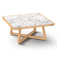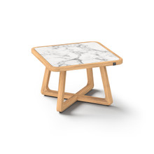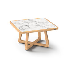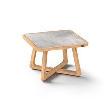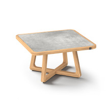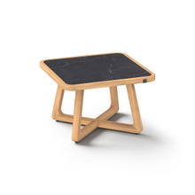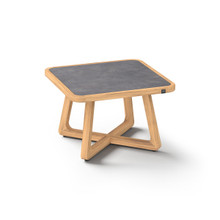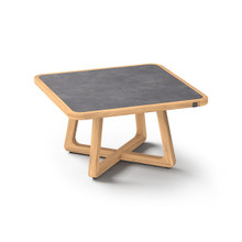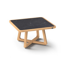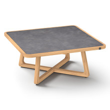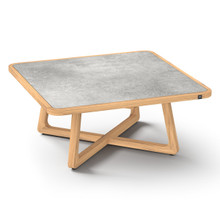 This gorgeous outdoor cocktail table has a memorable look and contemporary minimalist design. Its trapezoid criss-cross base and square frame are crafted using responsibly harvested plantation teak. The naturally oiled hardwood is resistant to warping, cracking and moisture damage. Its smooth-sanded surface has a rich honey-brown finish that fades to silver grey. Self-adjusting glides on the bottom ensure stability.