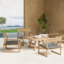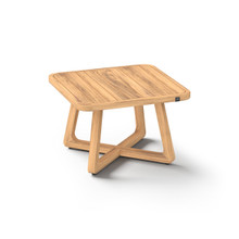 This cheerful patio cocktail table has a modern rustic style and minimalist design. Its rounded square tabletop and crossed base are made from eco-friendly plantation teak. The smooth-sanded durable hardwood is naturally protected from water damage, warping and cracking. Its lovely woodgrain starts with a golden honey-colored finish that transitions over time to an elegant greyish silver.