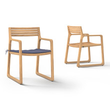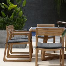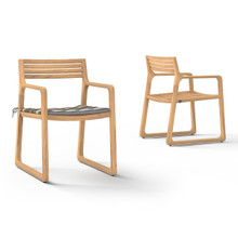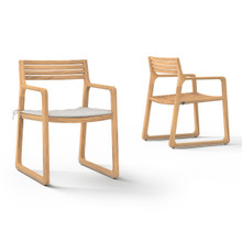 This lovely outdoor dining armchair has a minimalist modern design with a natural laid back feel. Its trapezoidal frame, with a sled runner-like base, has gently curved corners and seamlessly integrated armrests with a slatted seat and backrest. Made from solid plantation teak, this armchair is durable and eco-friendly. The smooth-sanded hardwood has a warm honey-colored woodgrain that will age to an elegant grey silver.