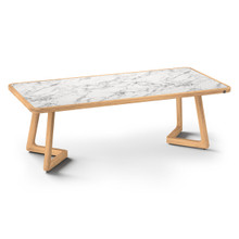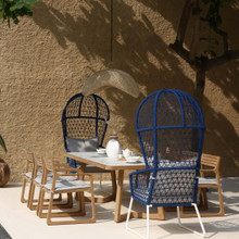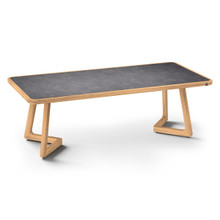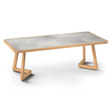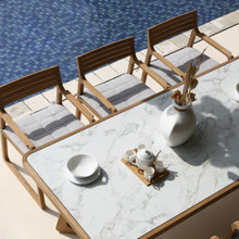 This striking patio dining table has an intriguing contemporary design and understated elegance. Its long rectangular frame and base are made from smooth-sanded premium plantation teak. The environmentally responsible hardwood is durable in even marine environments and resists warping and cracking. Its woodgrain begins with a honey-brown color that will eventually turn to silvery grey. The base has a unique soft v-cut form that blends seamlessly with the gently curving corners of the frame above.