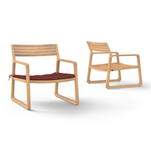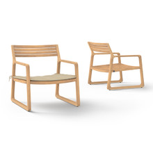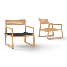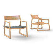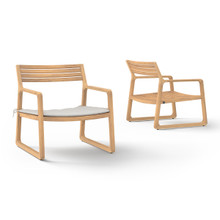 This stylish patio lounge chair has a cool contemporary design and laid back appeal. Its broad premium teak frame and slatted seat and backrest have a smooth-sanded finish and warm woodgrain. The durable environmentally-friendly hardwood fades to silver grey and resists water damage. Inspired by sled runners, the base has self-adjusting glides to make sure the chair remains stable on uneven surfaces.