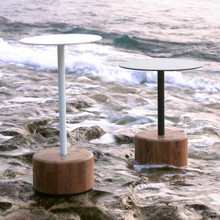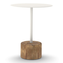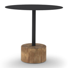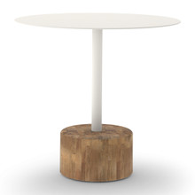 This stout patio cafe table has a unique contemporary design a easygoing vibe. Its thick cylindrical wooden base is made from reycled teak with a laminated patchwork finish and smooth surface.