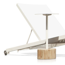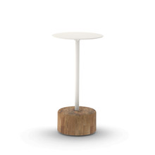 This quaint outdoor accent table has a minimalist modern design and casual feel. Its simple cylinder base is fashioned out of upcycled teak wood. The smooth laminated patchwork of this eco-freindly hardwood adds to the carefree and eccentric vibe of the table.