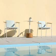 Aluminum is used for both the slim stem and small round tabletop above. The metal is protected from the elements by an ultra-durable powder-coating. This semi-gloss finish is corrosion-resistant and comes in your choice of three neutral tones.