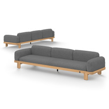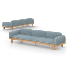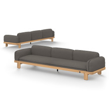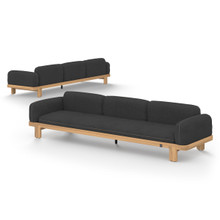 This stately patio sofa has clean lines and a Latin vibe. Its broad wooden frame and legs are crafted from premium teak with a smooth-sanded surface and natural woodgrain appearance. The eco-friendly hardwood is durable and resists warping and other weather-related damage.